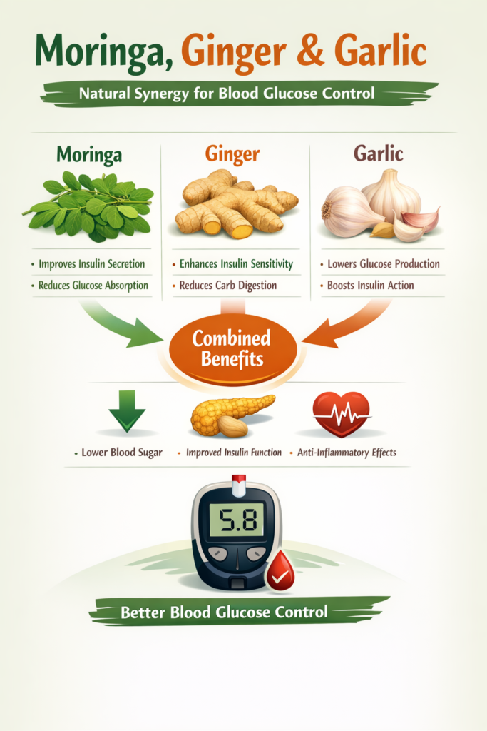 The combination of moringa, ginger, and garlic has been studied for its potential blood glucose–modulating effects, particularly in the context of type 2 diabetes or prediabetes. Here’s a clear breakdown of the scientific rationale and benefits: