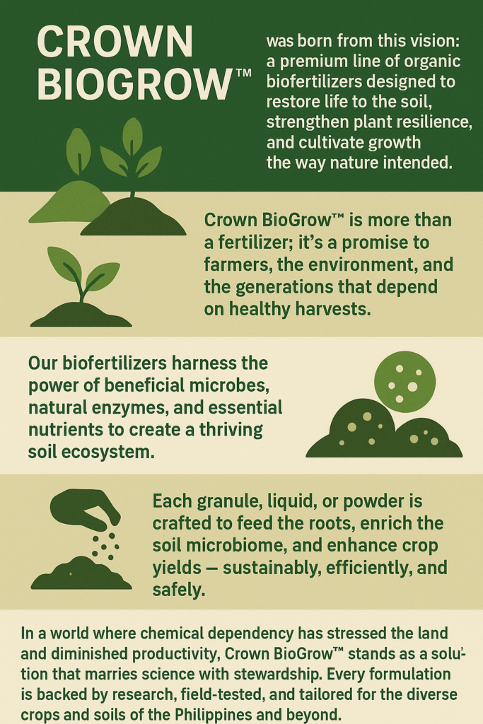 In a world where chemical dependency has stressed the land and diminished productivity, Crown BioGrow™ stands as a solution that marries science with stewardship. Every formulation is backed by research, field-tested, and tailored for the diverse crops and soils of the Philippines and beyond.