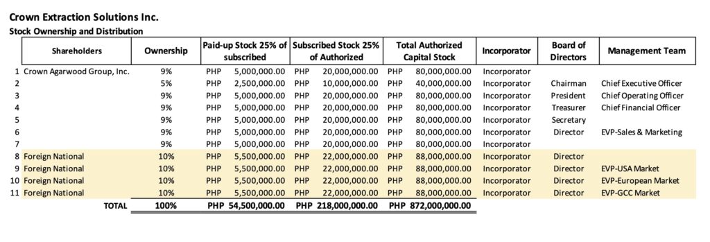• We can invite Foreign Investors interested on Agarwood Oil business of up to 40% ownership based on the Corporation Law of the Philippines.