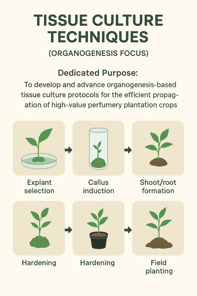 Dedicated Purpose: To develop and advance organogenesis-based tissue culture protocols for the efficient propagation of high-value perfumery plantation crops, ensuring: