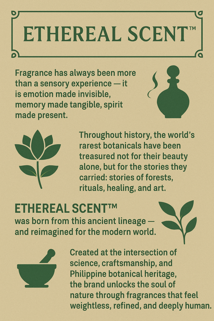 Rooted in the Philippines’ rich aromatic heritage and uplifted by world-class scientific expertise, Ethereal Scent™ stands as a new global standard for botanical fragrance creation.