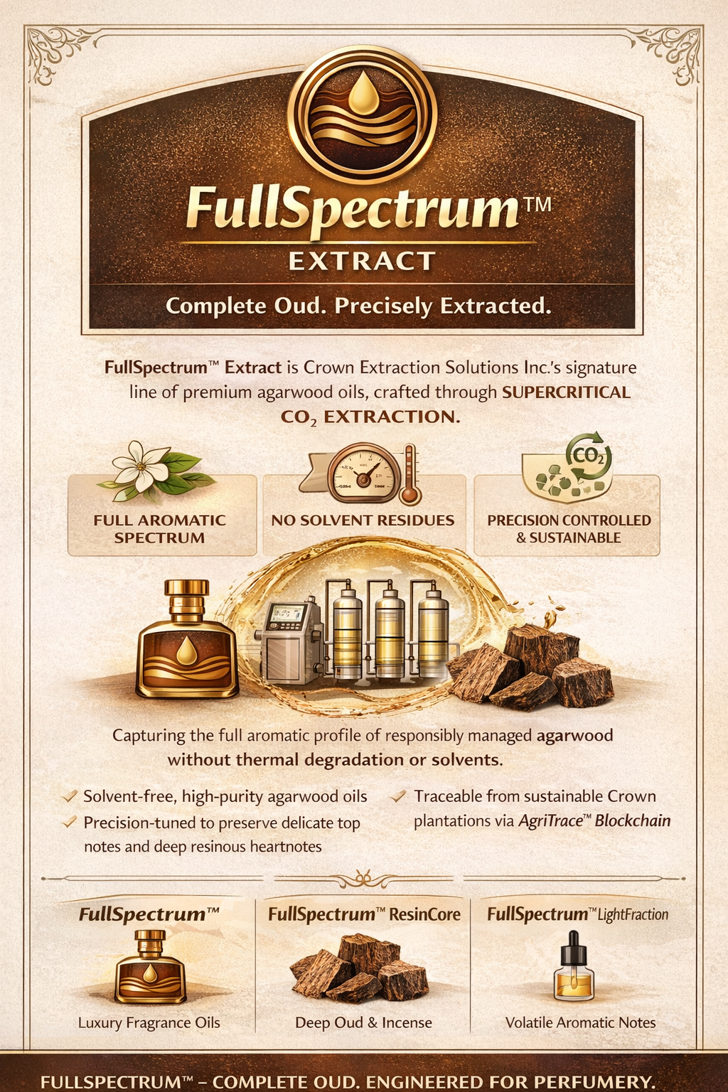FullSpectrum™ Extract is the premier line of agarwood extracts produced through Supercritical CO₂ Extraction by Crown Extraction Solutions Inc. (CESI). It represents the pinnacle of precision, purity, and aromatic fidelity in agarwood extraction, delivering the entire chemical spectrum of this revered resin—from the lightest floral volatiles to the deep, resinous chromone-rich heartnotes.