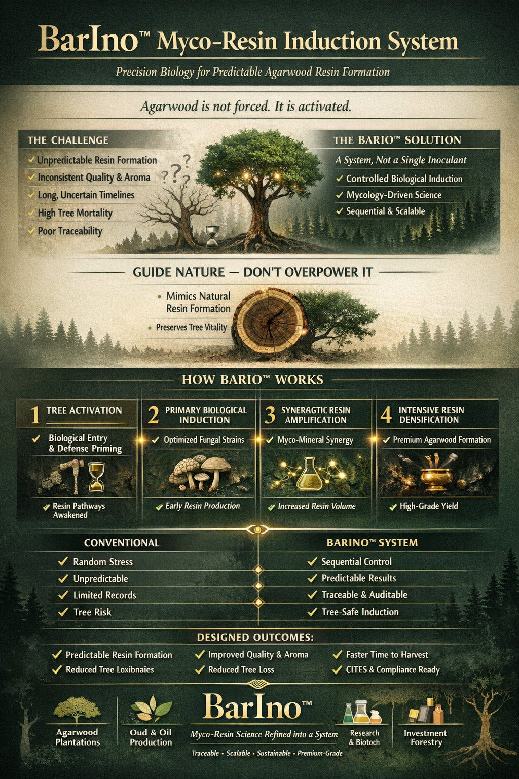 The BarIno™ Myco-Resin Induction System was developed to solve a problem the agarwood industry has long accepted as unavoidable: inconsistency. Unpredictable resin formation, uneven quality, long maturation timelines, and the absence of repeatable biological control have historically limited agarwood cultivation to chance rather than design.