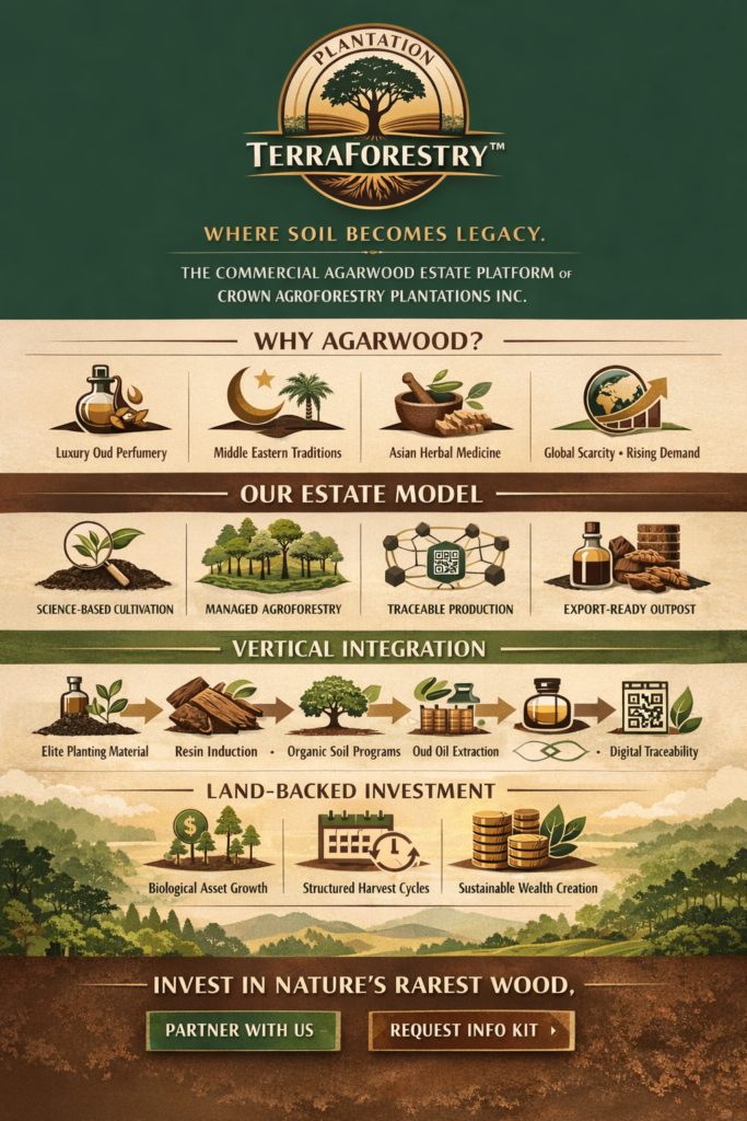 Developed and managed by Crown Agroforestry Plantations Inc. (CAPI), Plantation TerraForestry™ represents a new generation of structured agroforestry estates dedicated to the cultivation of one of the world’s rarest and most valuable natural resources: agarwood (Aquilaria spp.).